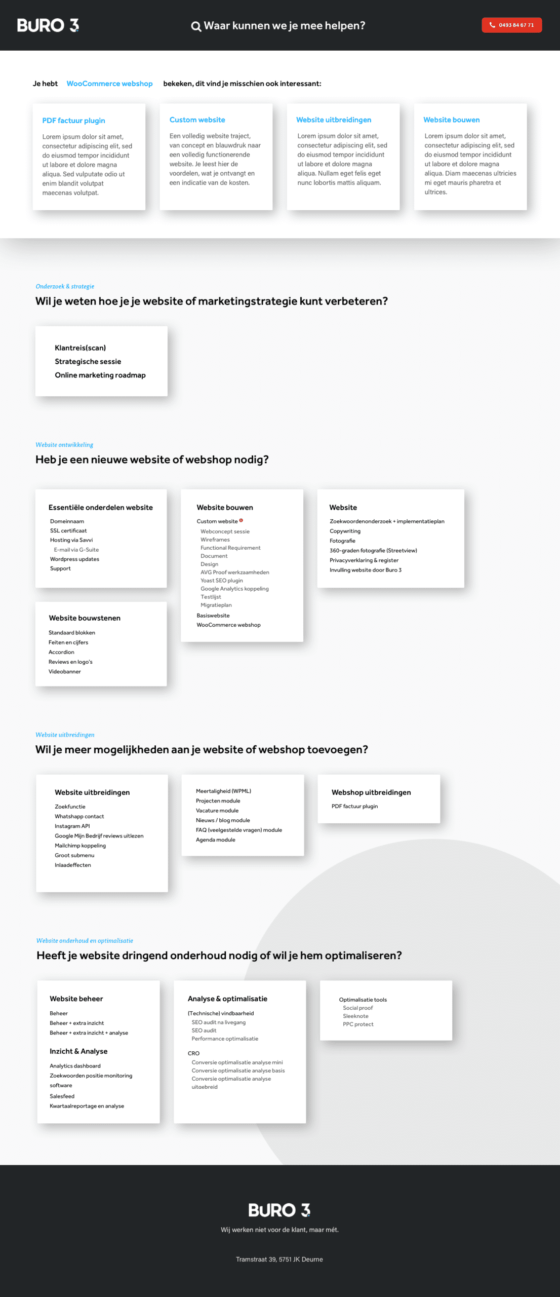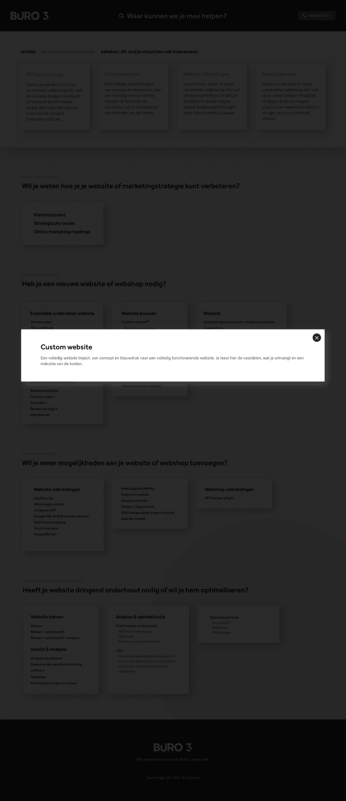 Aan de hand van de wireframes en de eisen van Buro 3 heb ik enkele designs gemaakt in Sketch. De iteraties en de eindresultaten zie je hierlangs. Ik heb designs gemaakt voor de homepagina, productkaarten en pop-ups. De homepagina wordt een overzicht van alle producten in sitemap stijl. Ik heb een universeel design ontwikkeld voor de productkaarten. WordPress zal dit design automatisch toepassen. De pop-ups voorzien klanten snel van meer informatie als zij op een moeilijke productnaam klikken.