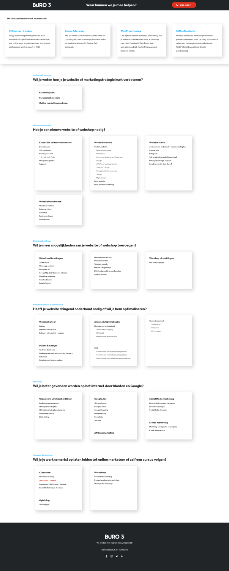 Omdat ik voor WordPress koos, heb ik ook meteen het basisthema van Buro 3 geïnstalleerd om mezelf tijd te besparen. Deze heb ik vervolgens volledig omgebouwd naar de online producten tool die je nu ziet. Daarnaast heb ik het bootstrap grid systeem gebruikt om alles netjes uit te lijnen. Ik heb ook geprobeerd om de tool hiermee responsive te maken, maar dat werkt nog niet overal even goed. Dit was volledig nieuw voor mij, dus ik ben heel blij met hoe ver ik daarmee gekomen ben.