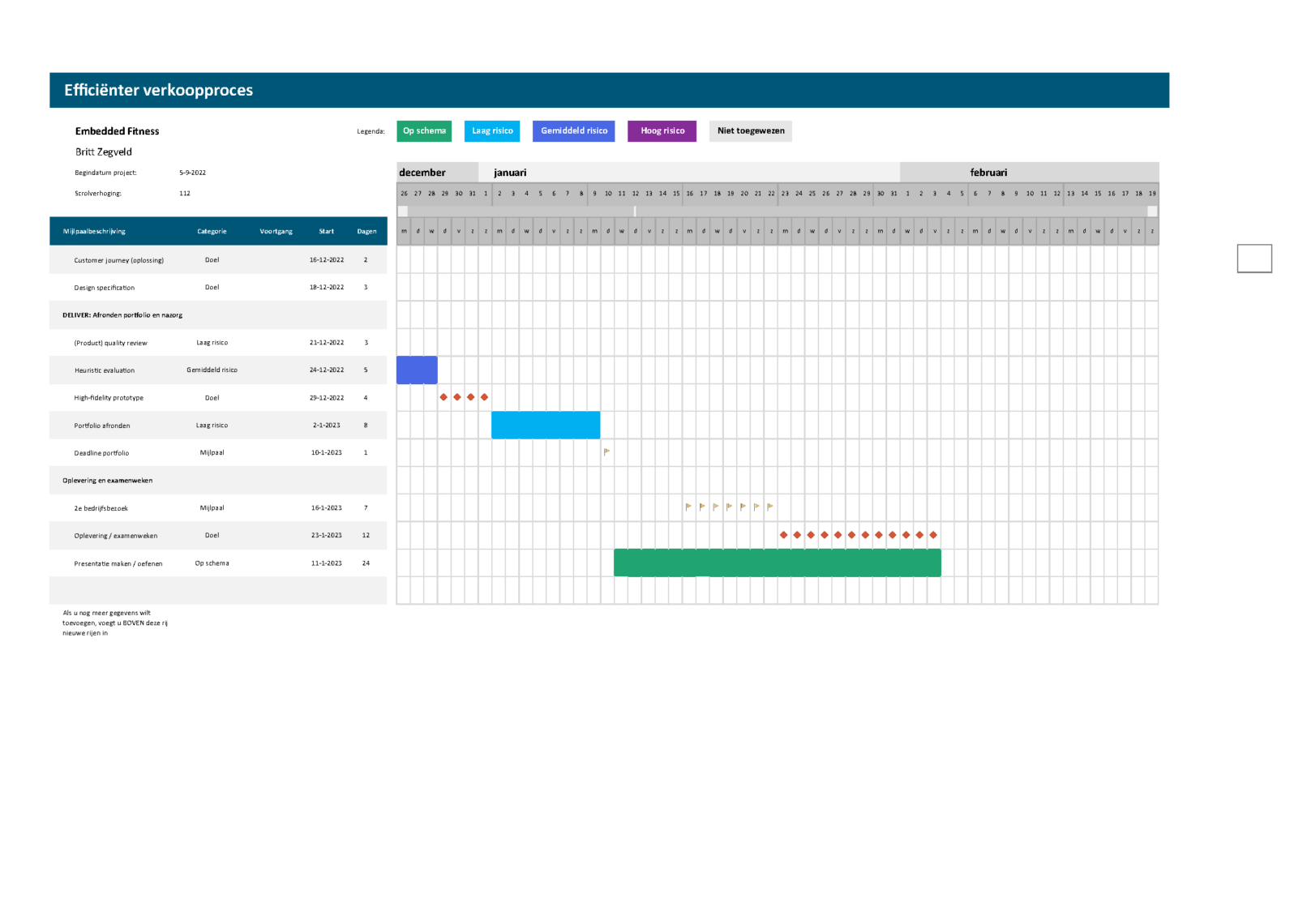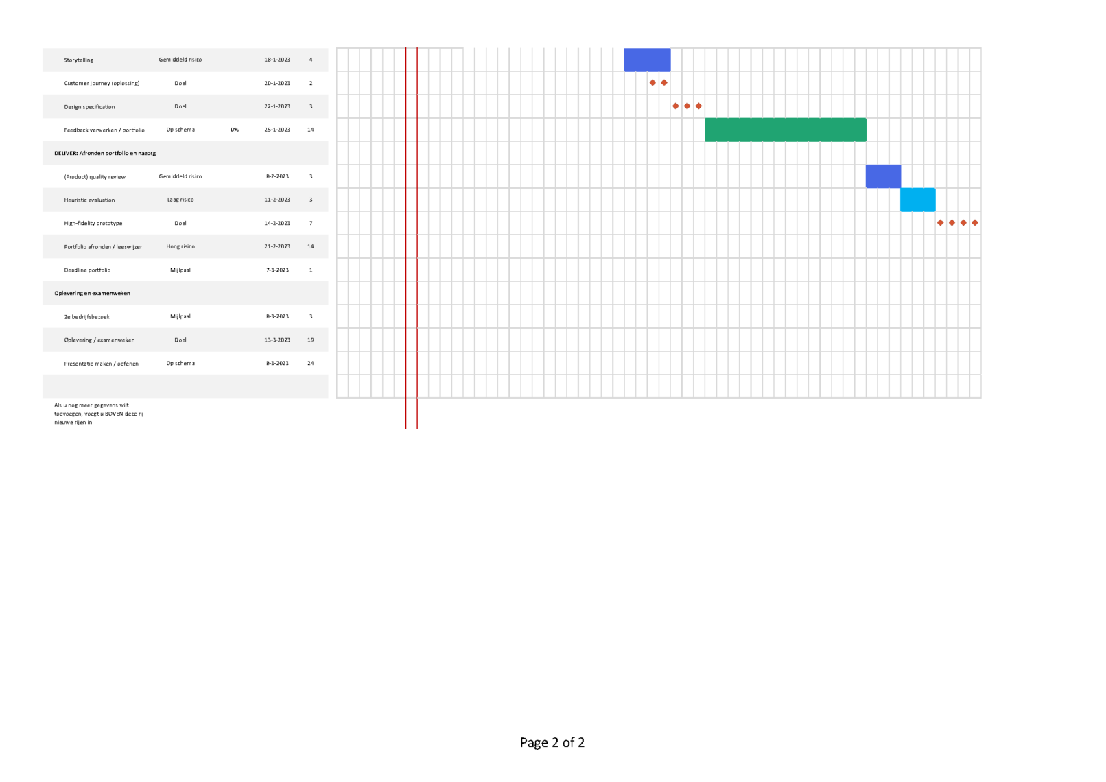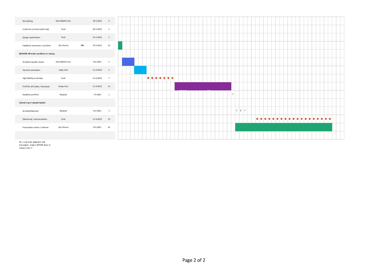 Tijdens het opstellen van het Project Plan heb ik verschillende planningen gemaakt. Ik heb een Gantt-diagram gemaakt. Deze kun je dus hieronder bekijken. Daarnaast heb ik een Scrum bord gemaakt op Trello. Deze heb ik vervolgens geïmporteerd in het Tasks gedeelte van Teams, omdat ik daar meer functies kan gebruiken. Hiervan staan ook afbeeldingen in de slider hieronder.